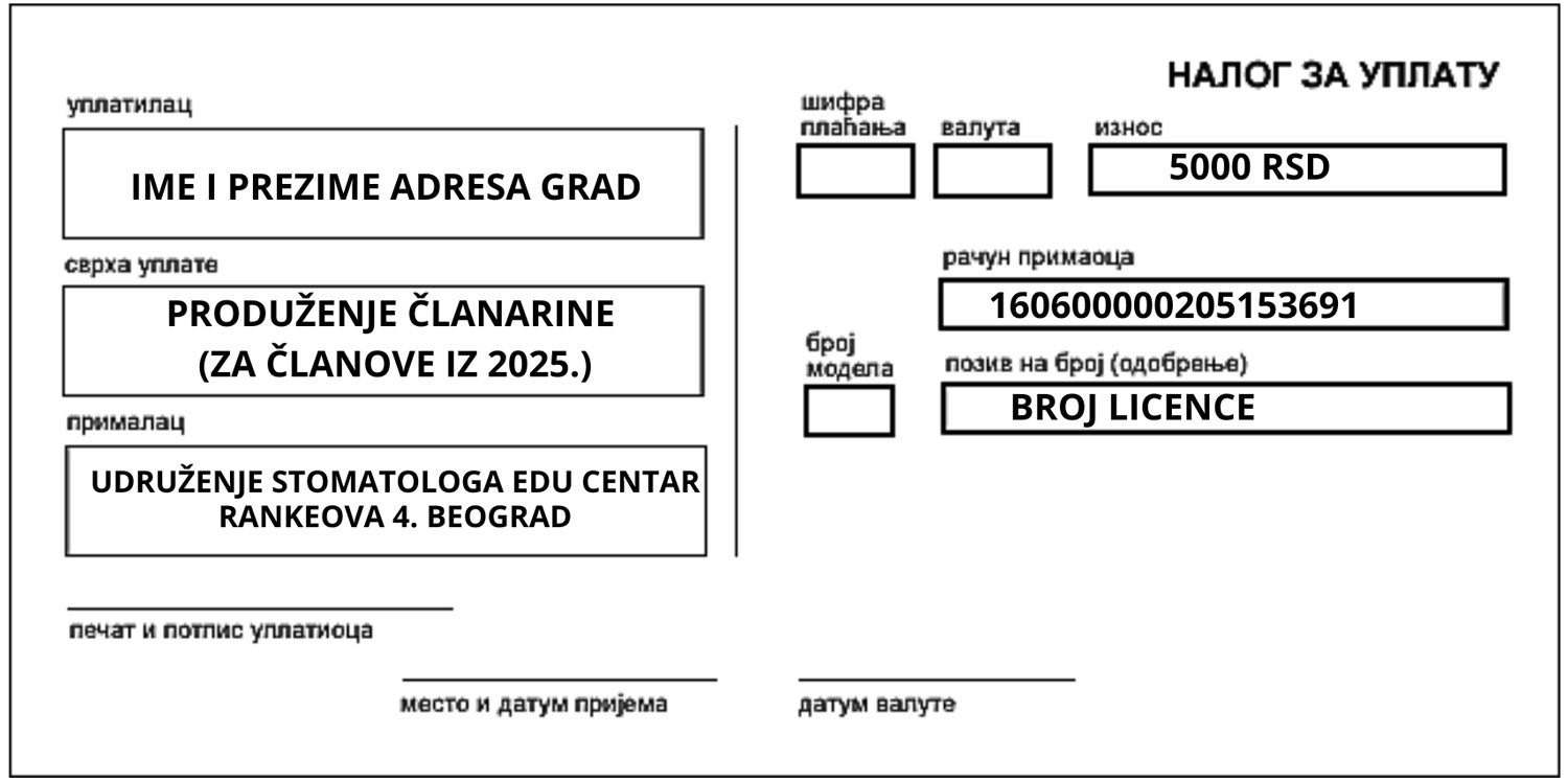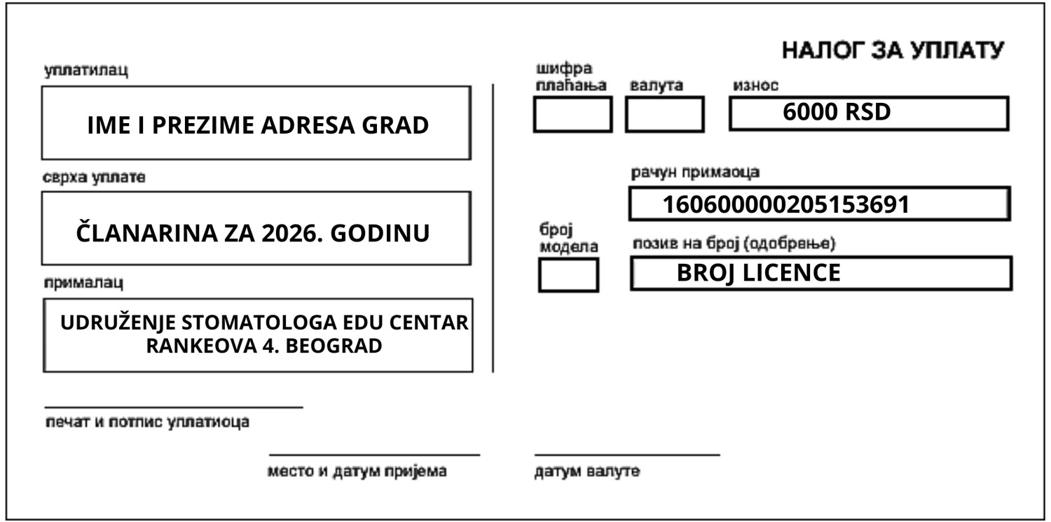 POSTANITE ČLAN EDU CENTRA OSTVARITE BROJNE POGODNOSTI POSEBNE PONUDE Prva ekskluzivna ponuda je od 30. marta do 9. aprilaza sve članove Pogledaj akcije GRATIS TRADICIONALNI SIMPOZIJUM Vebinar „Od tradicije do inovacije“ u trajanju od 3 dana – oktobar 2026. Akreditovan sa 21 bodom. POPUSTI ZA RADIONICE od 5 do 10% EDU centar u saradnji sa Neodentom NE PROPUSTITE! ENDO DAY – SPECIAL EDITION Međunarodni Seminar 23.05.2026.Stomatološki fakultet u BeograduPredavač: Prof. dr Hani Ounsi,svetski lider u endodonciji Kotizacija 4000RSD.EDU centar obezbeđuje GRATIS UČEŠĆE za prvih 100 članova prijavljenih na Seminar. Akreditovan sa 5 bodova. ZA ČLANOVE IZ 2025. obnova ČLANARINE 5000 RSD DO 15. MAJA 2026. ZA NOVE ČLANOVE PRISTUPNA ČLANARINA 6000 RSD DO 15. MAJA 2026. Nakon uplate popunite pristupnicu. Nakon uspešnog popunjavanja pristupnice, Vaša prijava za Simpozijum „Od tradicije do inovacije“ biće automatski registrovana.Novi članovi Udruženja stomatologa EDU centar dobiće svoju člansku kartu na kućnu adresu u roku od 30 dana od dana registracije.INFO: Beograd 064 647 4384 | Novi Sad 064 647 4377 FORMA ZA PRIJAVU(mail adresa mora biti jedinstvena) Vrsta članarine * Pristupna članarinaProduženje članarine Dodaj uplatnicu*